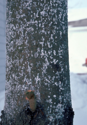 Most common on thin barked pine trees. They tend to cover the bark close to where branches extend from the trunk, but can fill the entire trunk when the population builds up, creating an almost snow-like affect on the trunk. These adelgids weaken the tree when present in large numbers, but are often not fatal. They tend to favor stressed tress, so maintaining healthy pine trees goes a long way to keeping this insect in check.